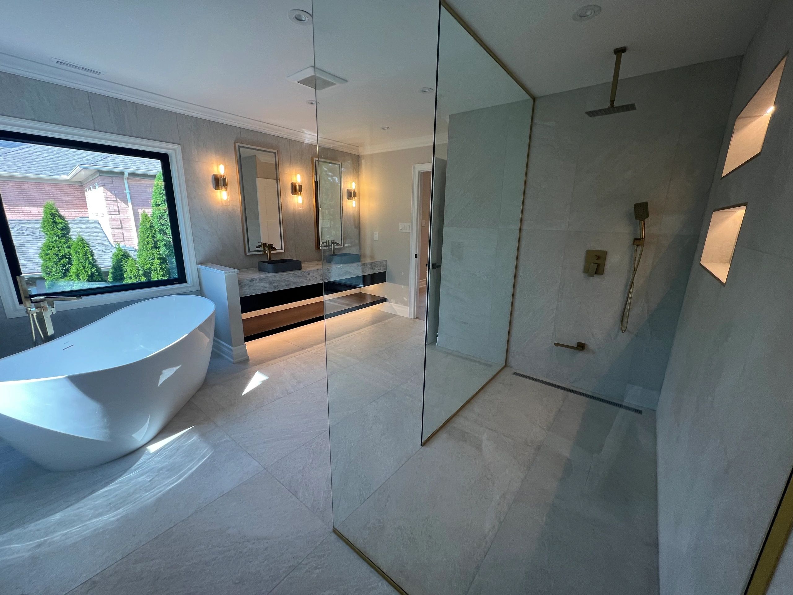 Each set starts with a real bathroom photo (top picture), followed by an AI-generated version to show how the tile transforms the space.
